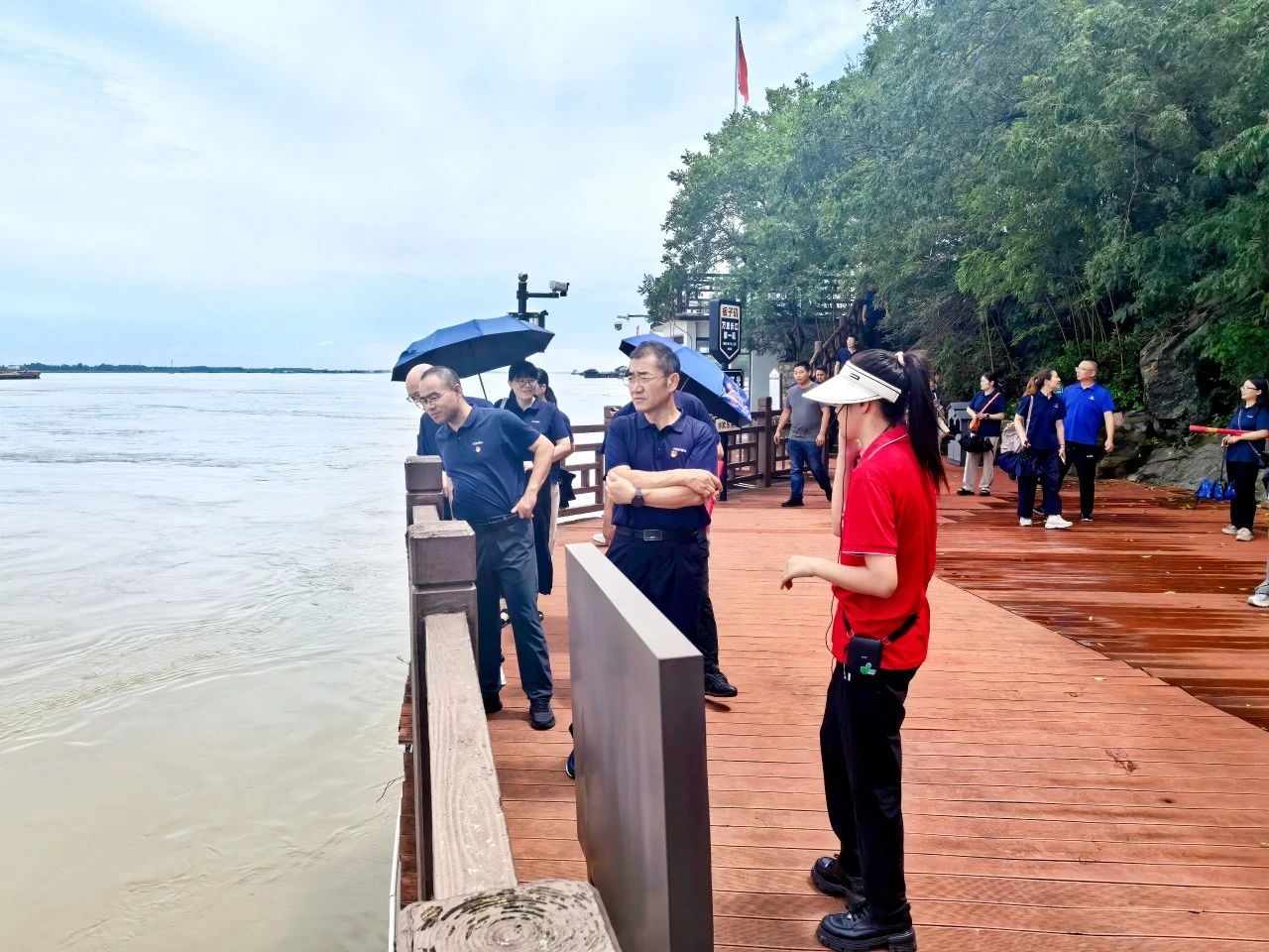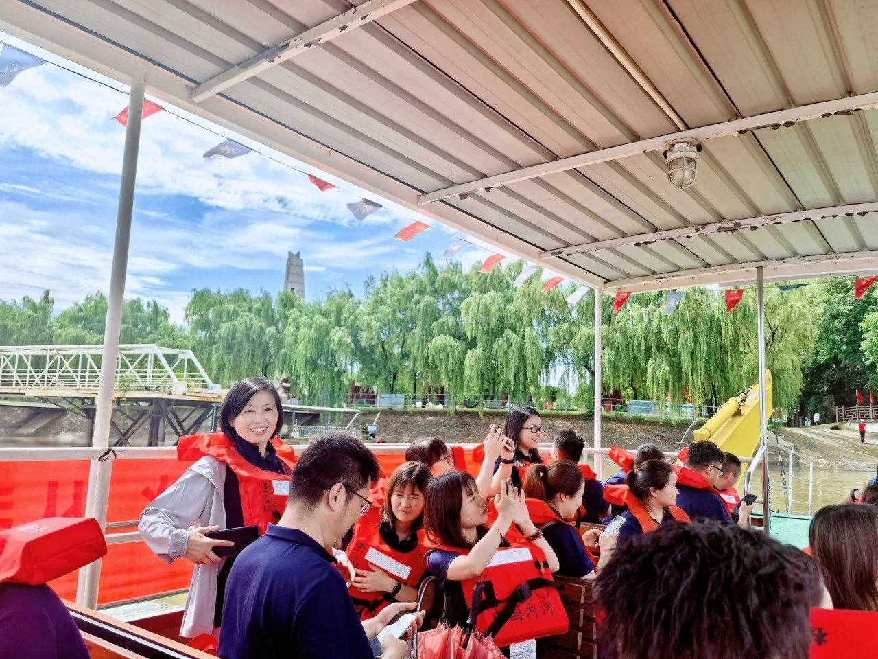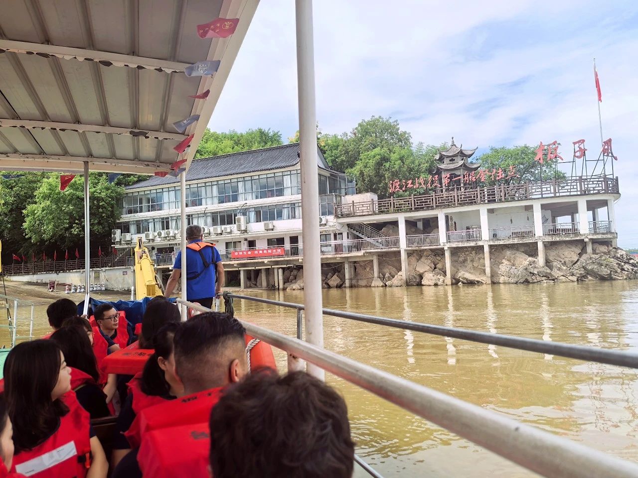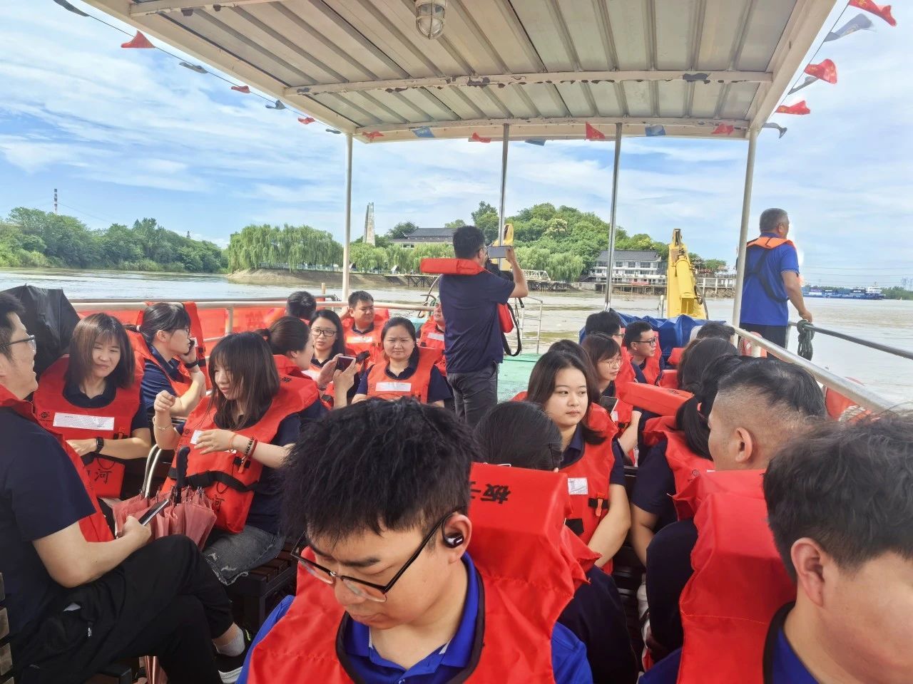 上午9時,全體黨員身著廠服、佩戴黨徽,在游船碼頭整齊列隊登船前往渡江戰(zhàn)役第一船登陸點——板子磯。江風獵獵,碧波蕩漾,黨員們遙望這片見證過歷史性時刻的江面,仿佛置身于76年前百萬雄師橫渡長江的壯闊場景中。